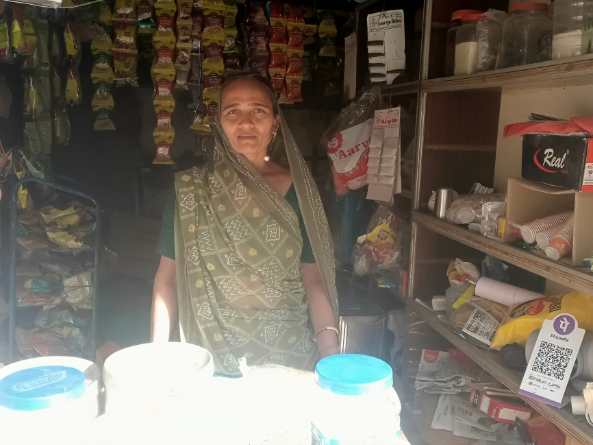 Bharati ben runs a small grocery shop in her village. With credit from the Utthan–Samarthan Credit Cooperative, she expanded her shop and built a steady family income.